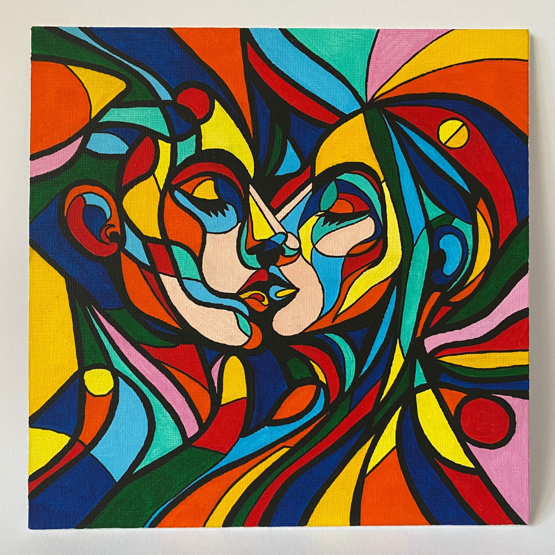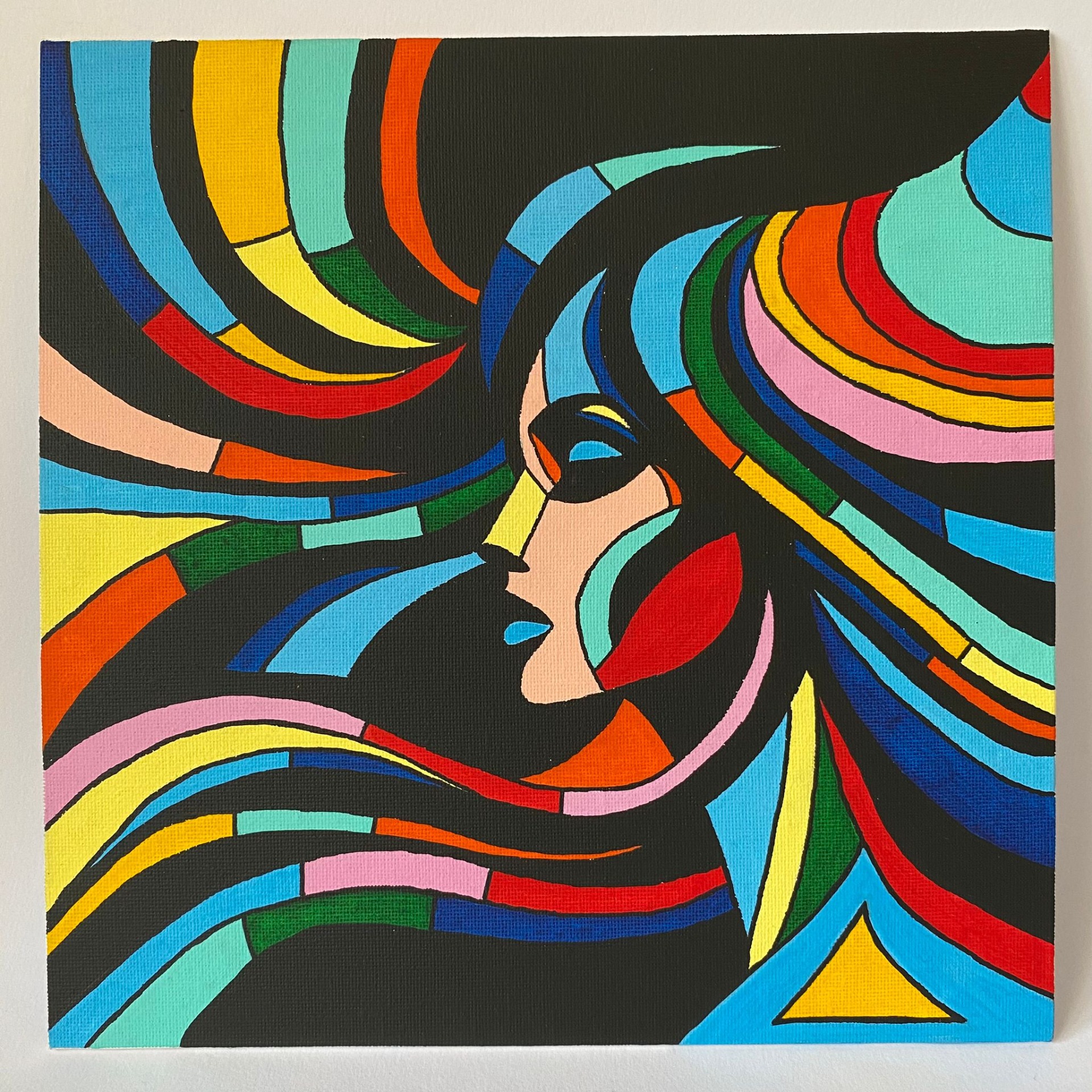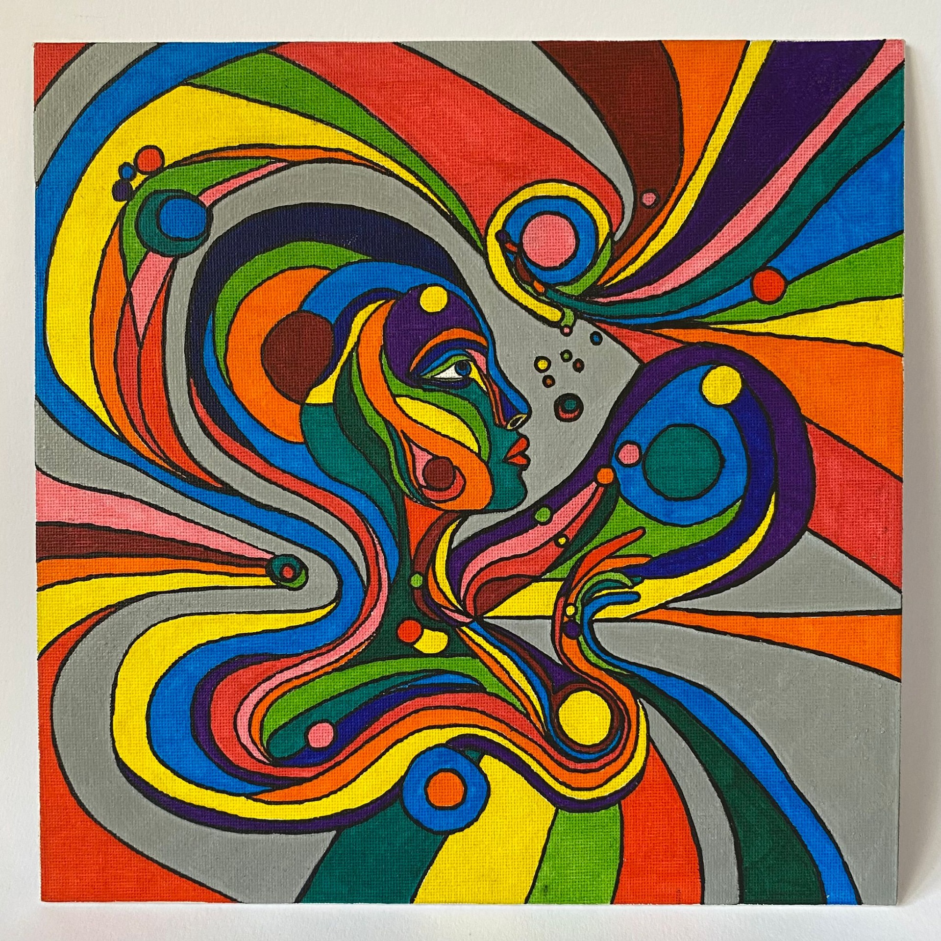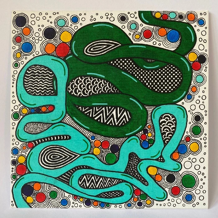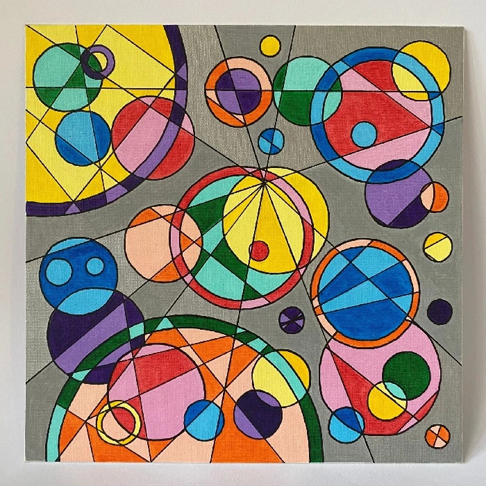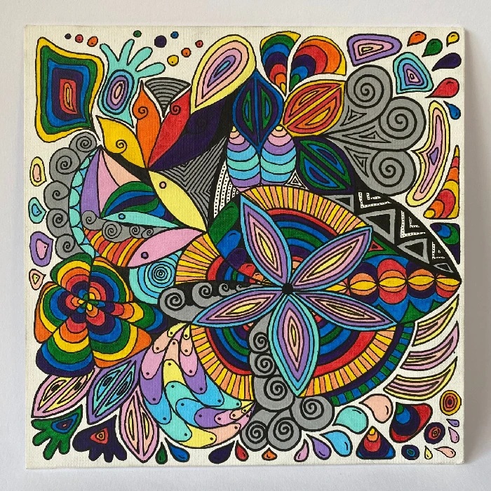 Tento obraz je jako barevná mandala – živý kaleidoskop tvarů, vzorů a rytmů, které evokují přirozený pohyb života. Prolínají se v něm geometrické i organické prvky, motivy květů, spirál a abstraktních linií, symbolizující růst, proměnu a vnitřní harmonii. Celek zve k zastavení a tichému ponoření do vlastní intuice, kde se obraz stává prostorem introspekce, hravosti a nových perspektiv.