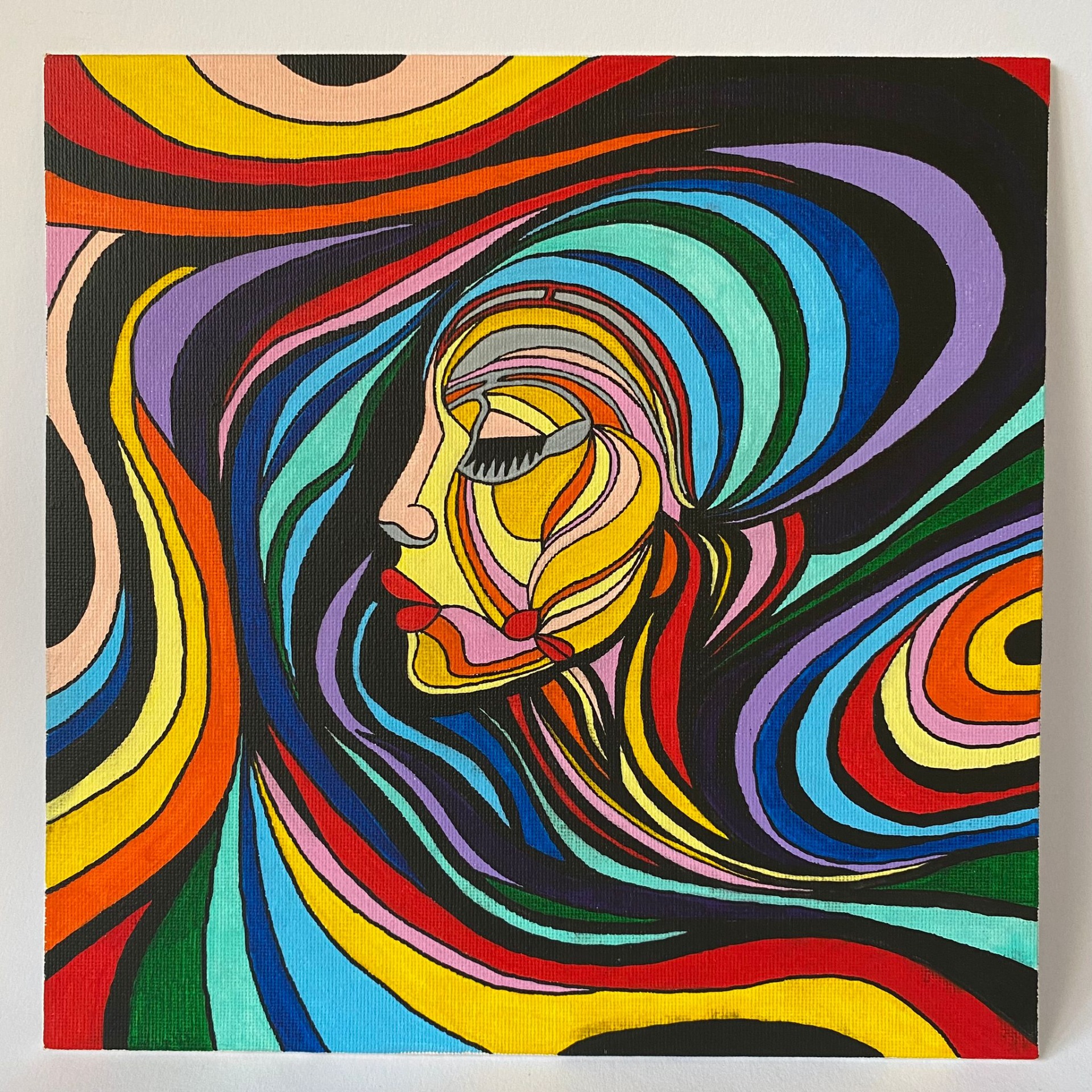 Obraz zachycuje vnitřní svět člověka jako proud myšlenek a energií, které se prolínají, střetávají a znovu spojují v harmonický celek. Barevné linie symbolizují rozmanité frekvence mysli, intuici i vnitřní dialog, jenž nás vede k porozumění sobě samým. Dílo připomíná, že i uprostřed chaosu lze nalézt klid a jasnost, když dovolíme myšlenkám plynout a přijmeme všechny části své vnitřní krajiny.