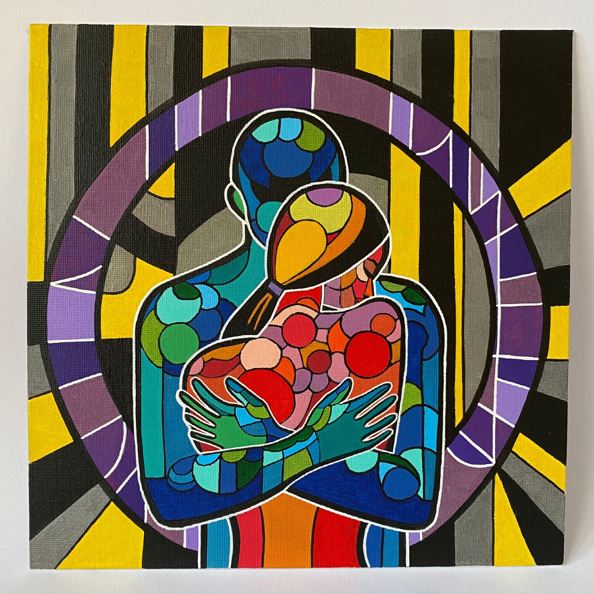 Obraz představuje hlubokou symboliku propojení dvou duší, které se vzájemně objímají, obklopují, podporují a společně tvoří harmonický celek. Barevné proudy a jemné linie, které se kolem nich vinou, symbolizují energetická vlákna, která nás propojují s ostatními, ať už na úrovni emocionální, duchovní, nebo intuitivní. Tyto propojené proudy vyjadřují, že vztahy mezi lidmi mají mnohem hlubší dimenzi, než si často uvědomujeme. Kruh, jenž obklopuje dvojici je symbolem věčného cyklu života, nekonečného putování duší, které se vzájemně nacházejí. Barevné linie v pozadí, které přecházejí od žlutých odstínů až po temnější tóny, zachycují škálu společných prožitků – od štěstí a radosti po zkoušky, které posilují jejich pouto.